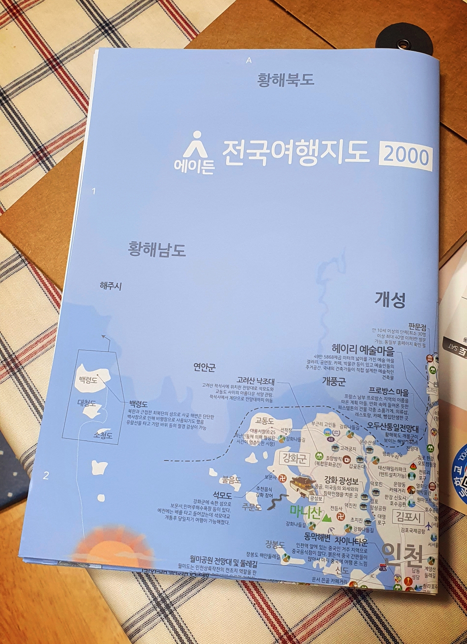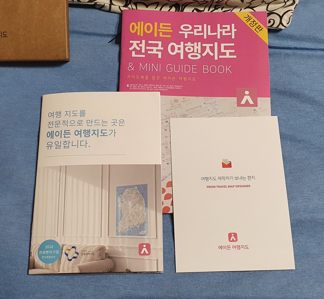 스티커랑 여행책자랑 들어있는 패키지와 방수처리된 휴대용 여행지도.