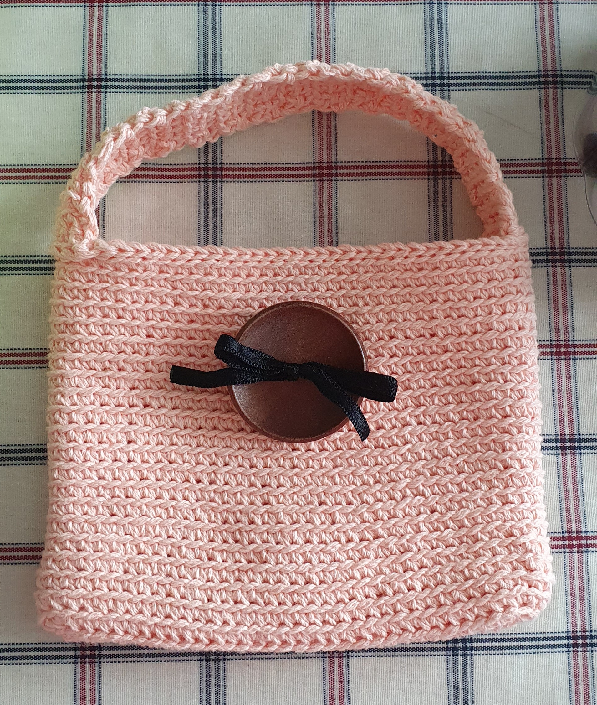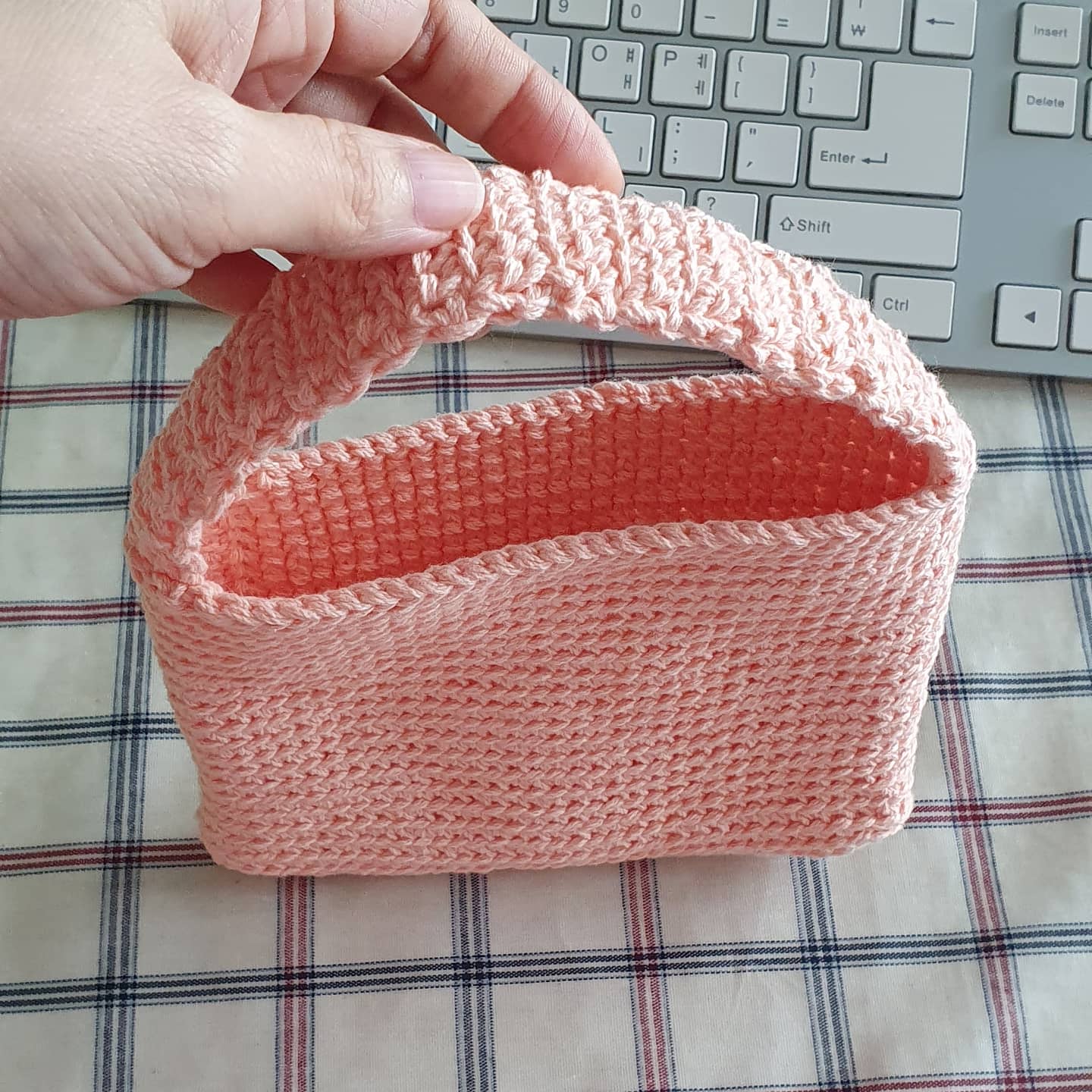 코바늘 기본뜨기로 점철된 미니 손가방.