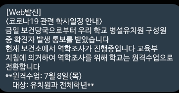 거리가 좀 되는 초등학교에서 확진자가 발생했다는 소식을 들은 지 하루 만에 애들 학교에서도 확진자 소식이다.