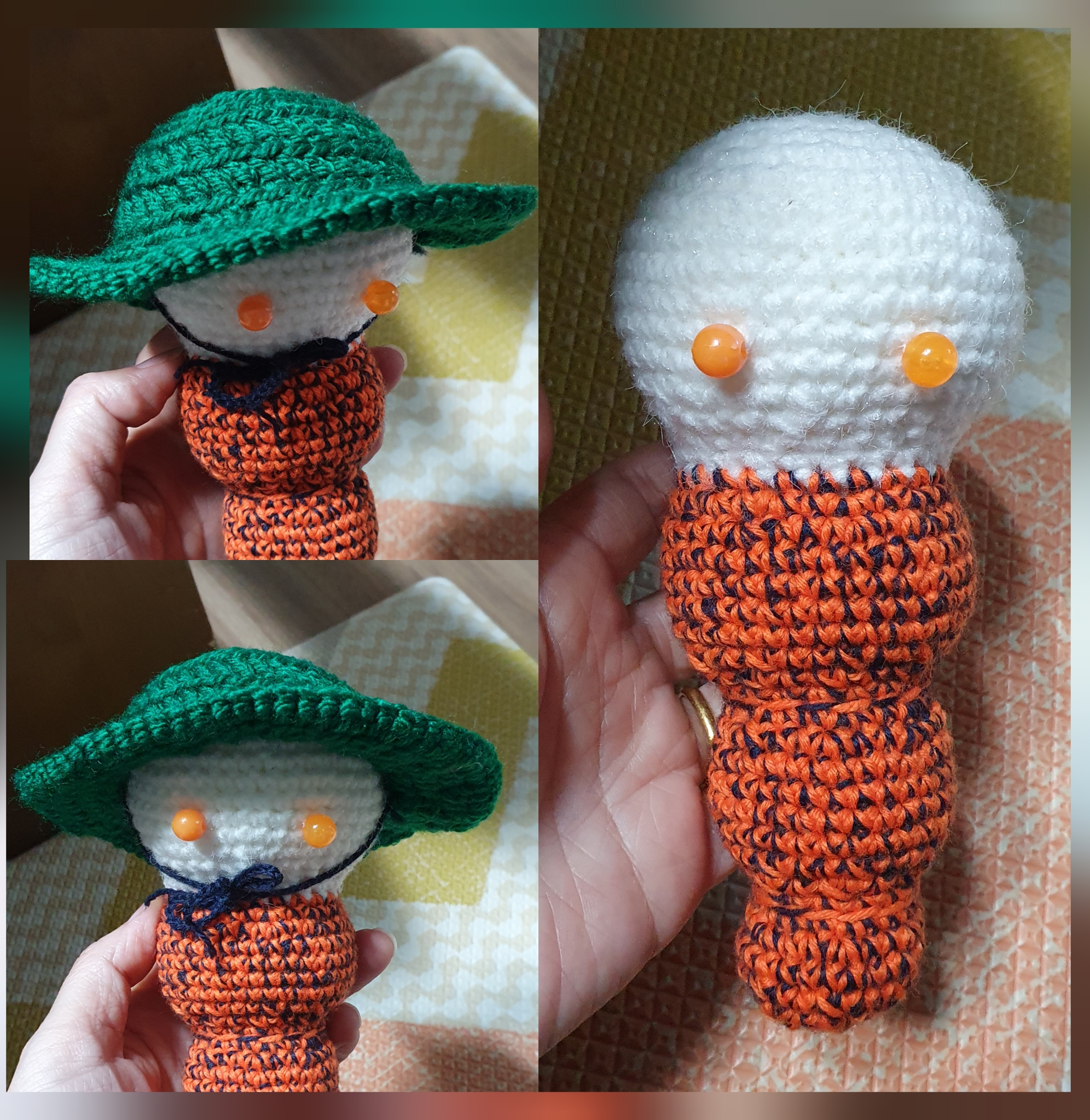 만들기 시작했다. 머리로 할 실의 두께에 맞추다보니 주황과 남색을 합사해서 떴더니 아주 강렬한 애벌레의 탄생을 예고하고 있다.