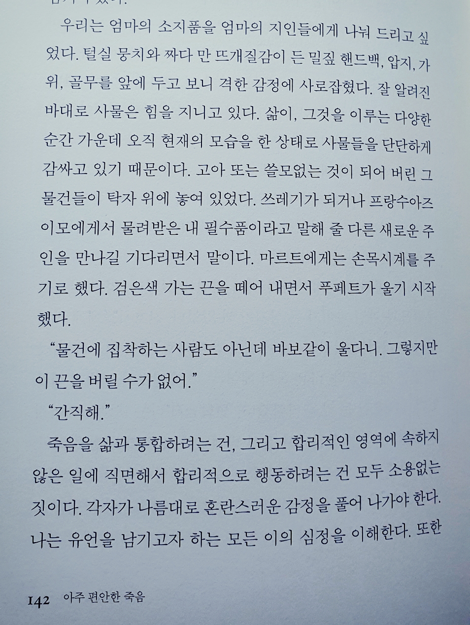 보부아르의 어머니의 죽어가는 과정이나 마지막 모습이 실상 편안하다 여겨질 수 있을까 싶지만 고통스러운 순간 이마에 손을 얹어준 존재가, 마지막을 함께 한 존재가 있었단 이유로 편안한 죽음으로 귀결되는구나.