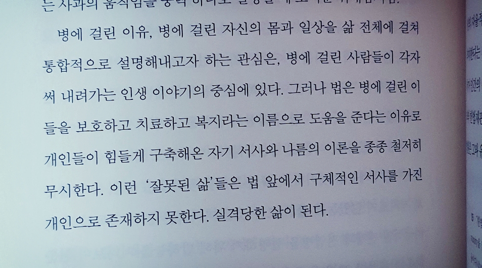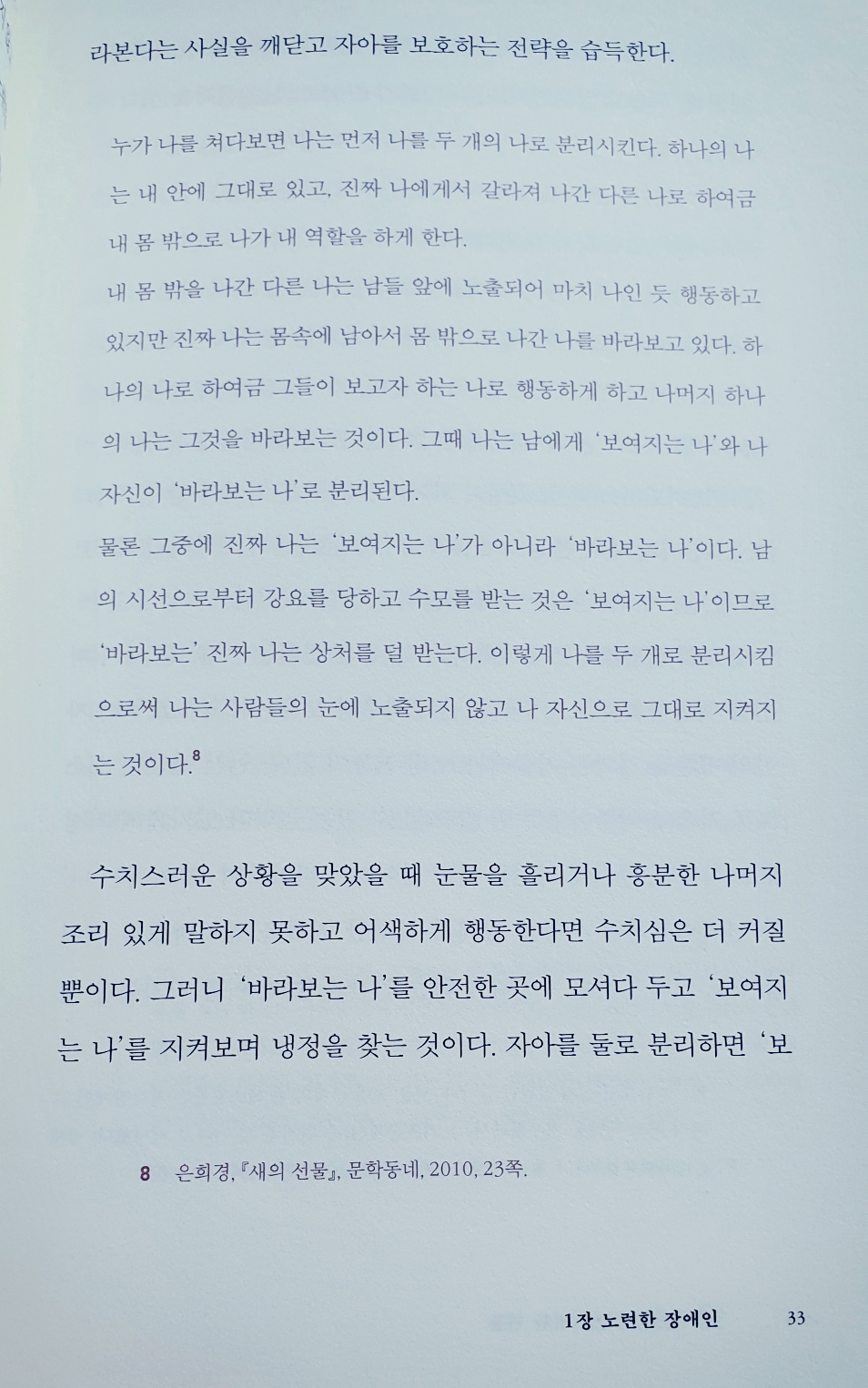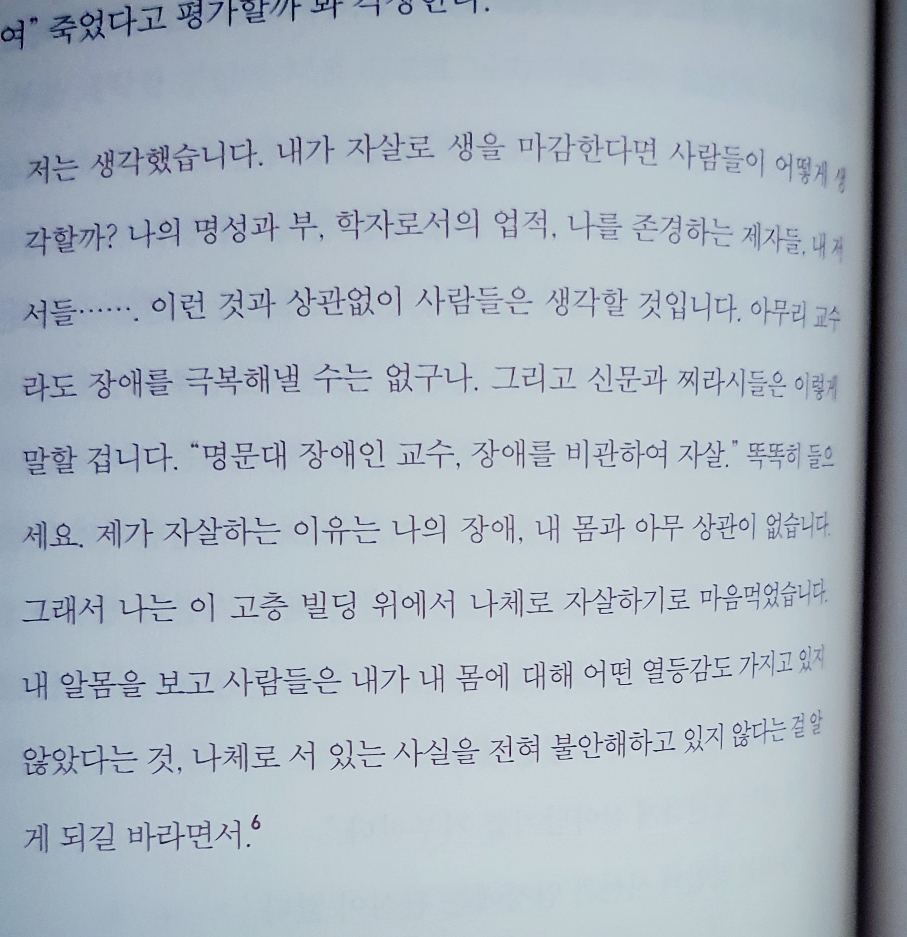김원영 작가(혹은 변호사)가 성장하면서 본인의 정체성에 대해 정의내리고자 많은 노력을 했다는 것이 이 책에서 보였다. 나에 대해 명확하게는 아니더라도 정리되면서 남에 대해서도 들여다보게 된 게 아닐까?