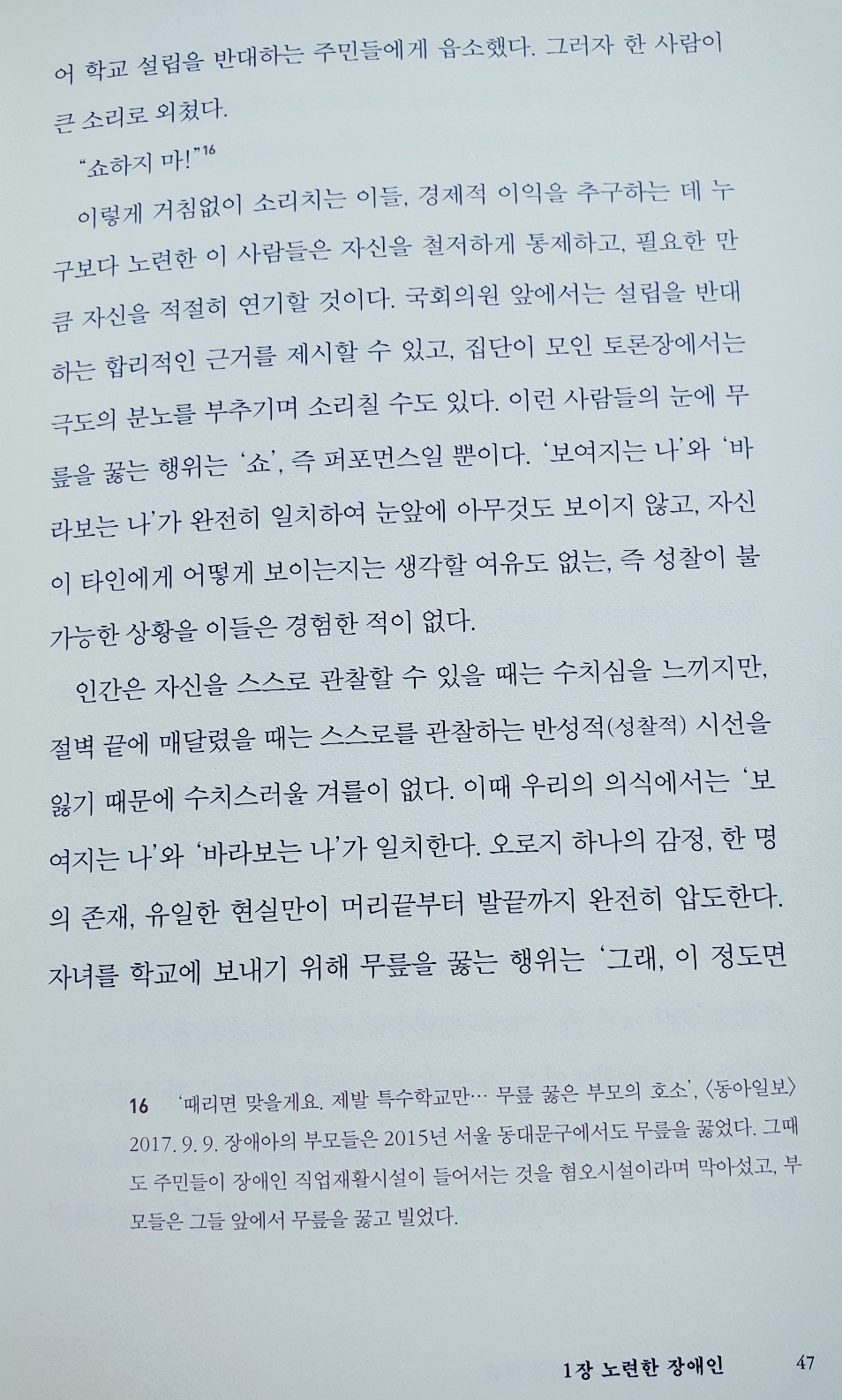 하지만 책을 읽으면서 그냥 무관심하게 지나가는것이 예의인가..경호원처럼 밀착보호하는 건 아니더라도 장애인을 만나면 도와줄 일이 있을지 모르니 관심을 갖고 있어야하는 것이 예의인가, 정신 발달장애인을 만나면 저 큰 손으로 날 때리는 상황이 벌어지면 안되는데 란 걱정도 할 때가 있었다. 신체적으론 내가 상대적인 약자여서 그런거라며 자기변명도 속으로 하면서.