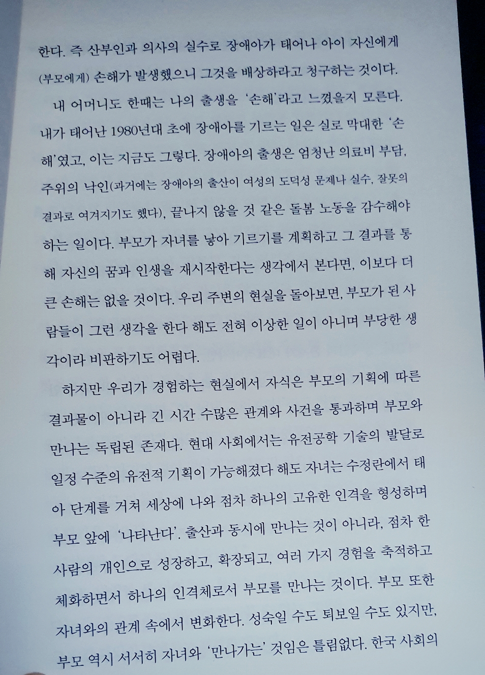 둘째를 임신 중 기형아 검사 결과가 좋지 않게 나왔다. 0과 1이 아닌 뱃 속의 아이가 기형아일 확률에 대한 이야기였고 그당시 난 어떤 아이든 낳을거란 생각에 양수검사를 하지 않겠다 했다. 그땐 그랬다. 하지만 이 책을 읽는 동안 내가 정말 그런것 맞아? 의문이 들었다. 그냥 비장애아가 태어날 거라는 막연한 확신이 들어서 그런거 아냐? 나와 랑군, 그리고 각자의 조상들 중 장애를 가진 사람이 없었기에 들었던 일종의 자신감으로 그렇게 쉽게 결정을 내릴 수 있었던 건 아니었을까? 막상 아이가 태어났는데 의사의 경고대로 장애를 가진 아이였다면?