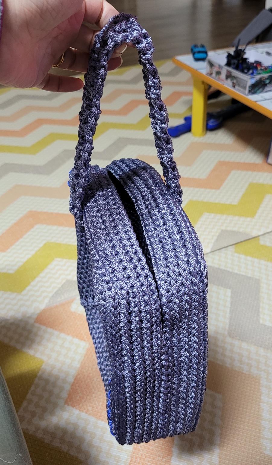 재밌어보여서 만들었는데 평면이 쭈글쭈글해져서 좀 아쉽게 되었다. 지퍼달면 딱 좋을 입구형태인데 꼬매는게 일이 될 것 같아서 저렇게 스트랩을 달았다.