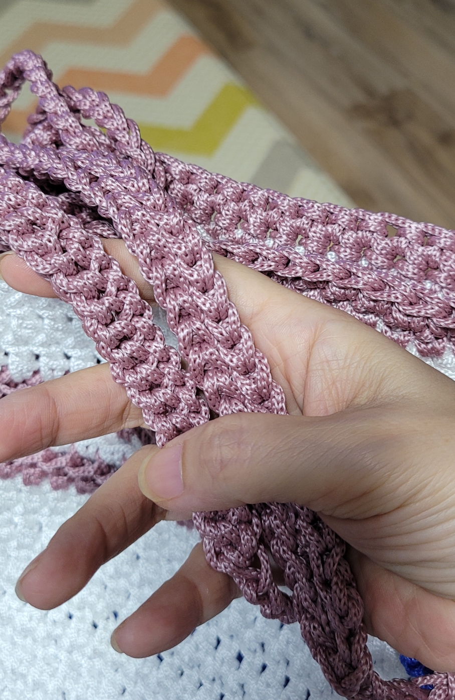 집에 있는 실로 숄더백을 만들었다.