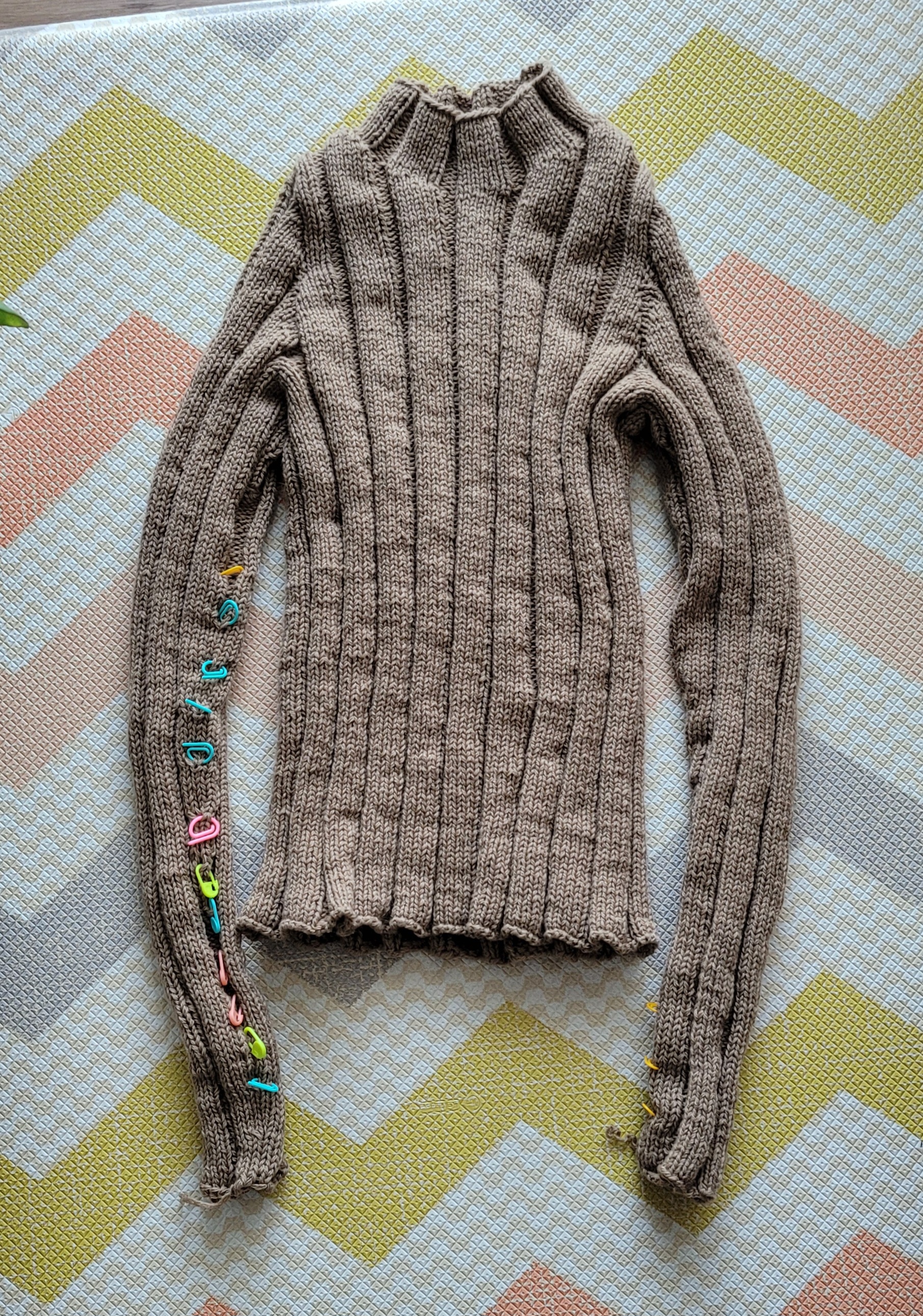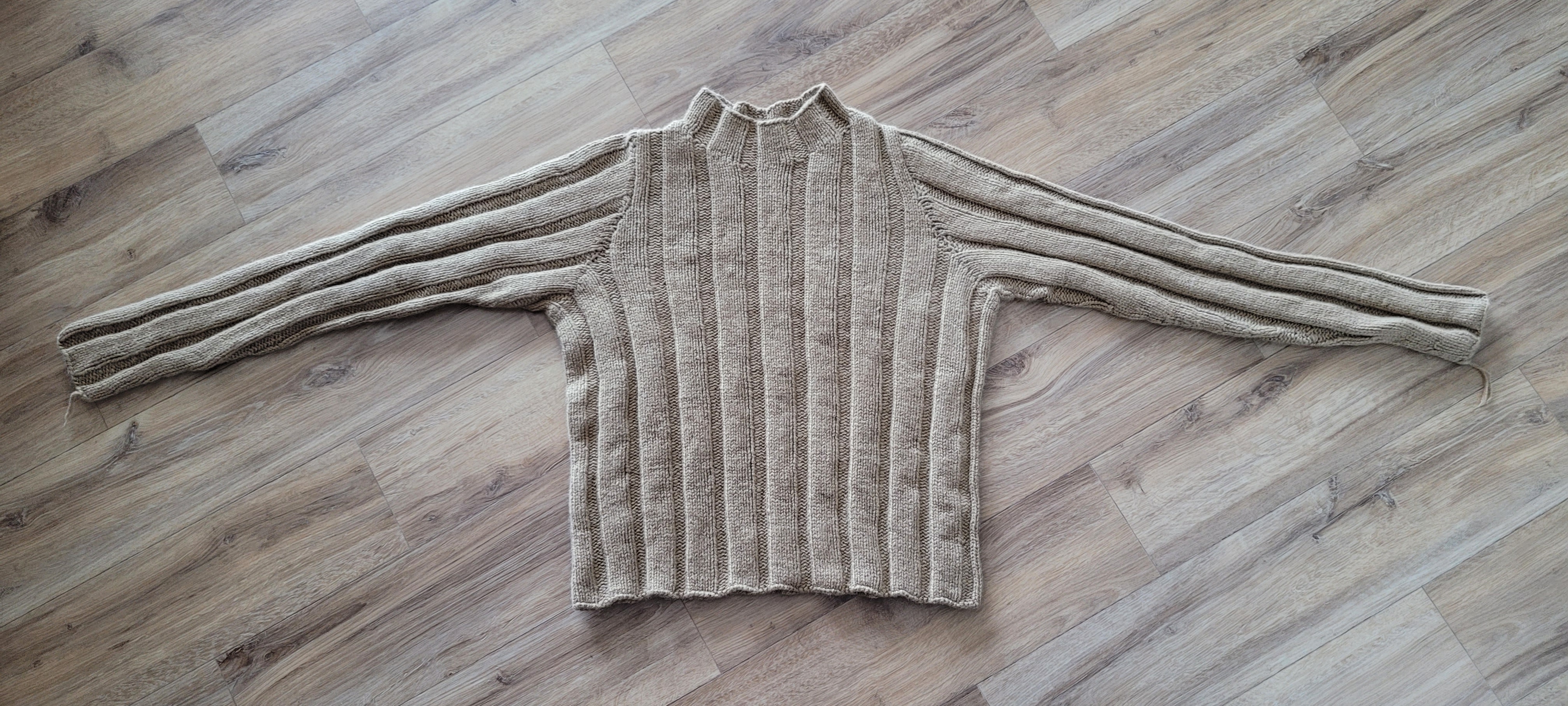 넥부터 시작해서 쭉 떠내려가는데 앞 뒤를 4분할해서 경사뜨기를 진행하고 그 후 나머지 몸체를 쭉 떠내려가요. 그리고 소매코를 줍고 셋인으로 소매를 답니다.