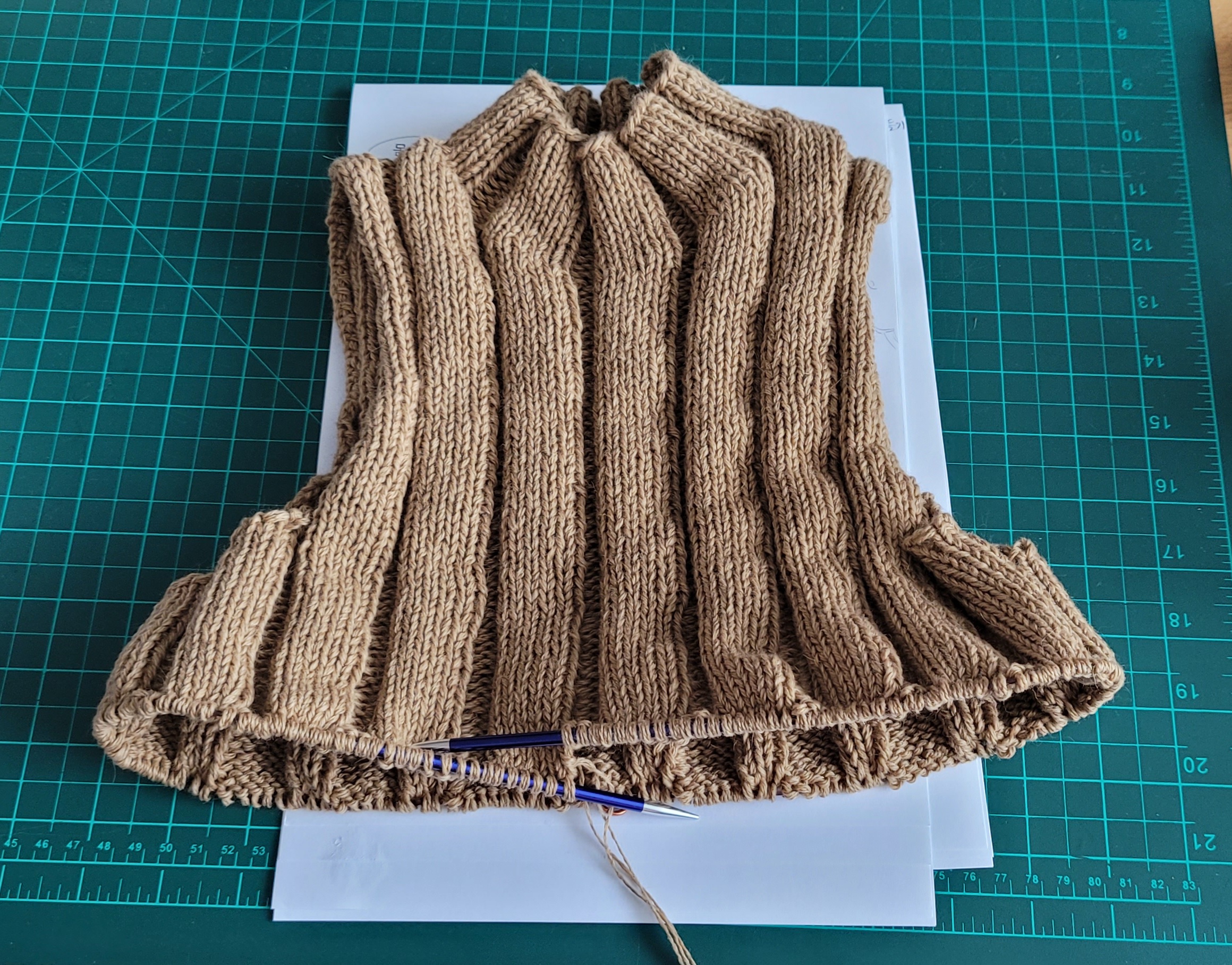완전 초보자분들보다는 경사뜨기나 탑다운의류의 이해가 어느정도 있으신 분들이 시작하시는 것을 추천합니다. 고무단 무늬가 이어지는 것도 신경써야해요.