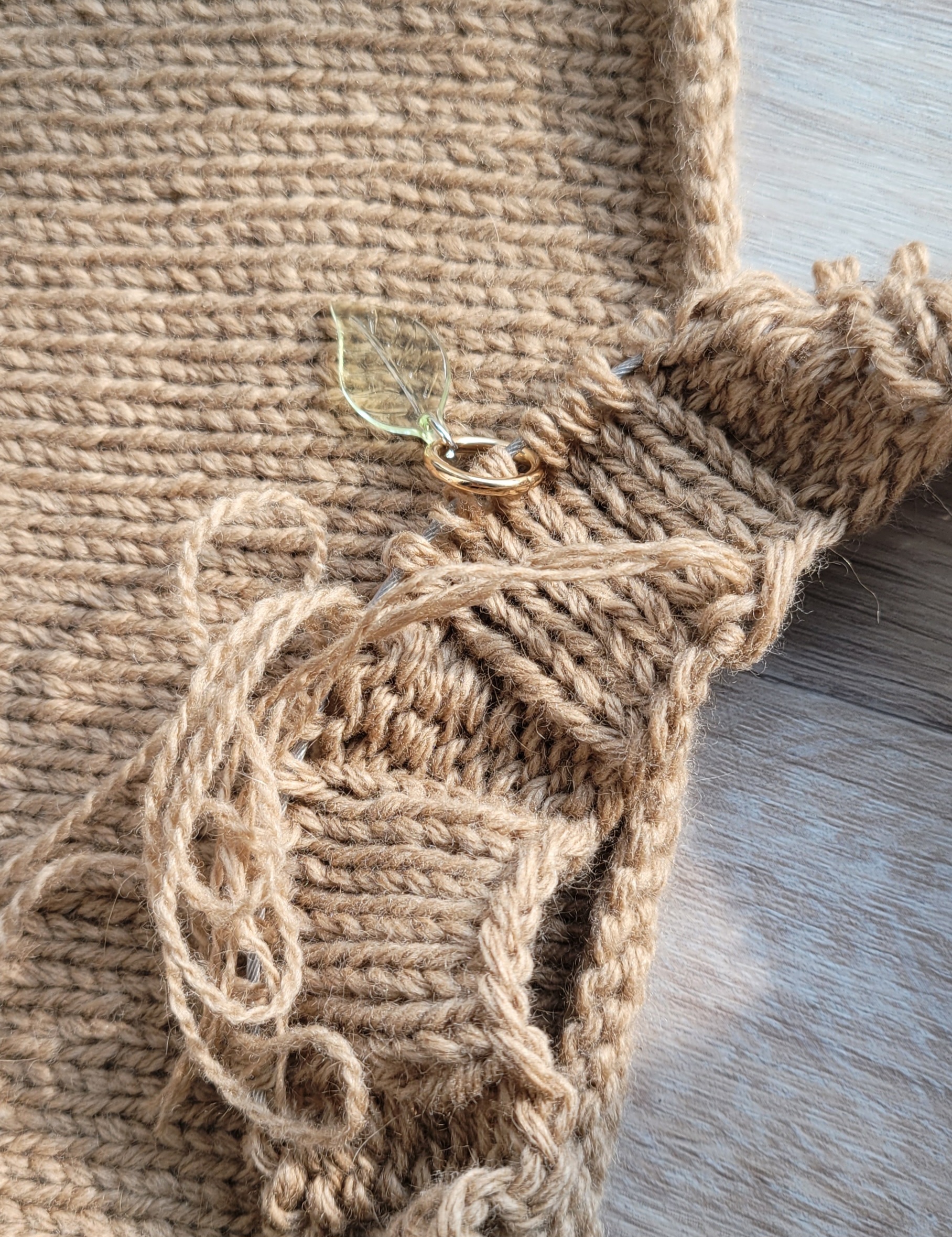 넥부터 시작해서 쭉 떠내려가는데 앞 뒤를 4분할해서 경사뜨기를 진행하고 그 후 나머지 몸체를 쭉 떠내려가요. 그리고 소매코를 줍고 셋인으로 소매를 답니다.