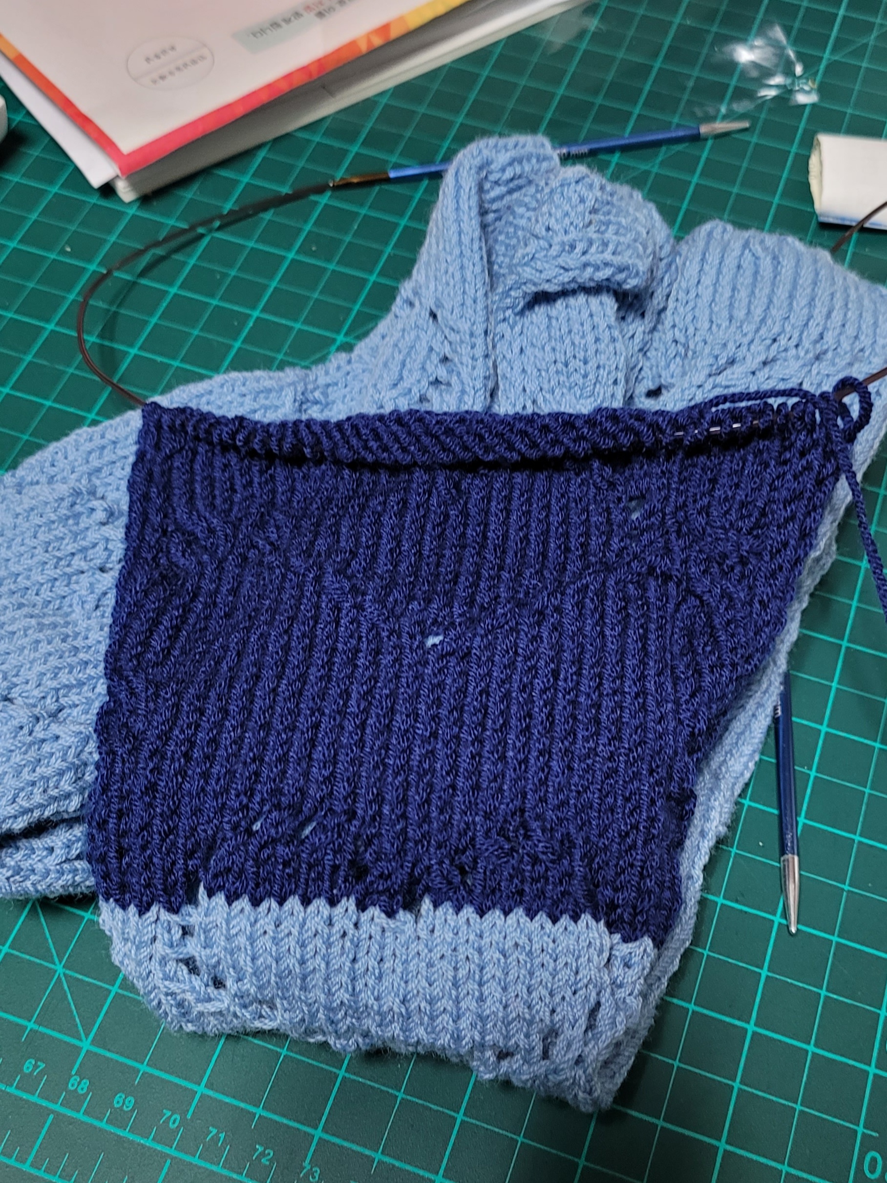 실은 전에 나눔받았던 밀라노와 삼성 제일모직 울소프트이고 둘 다 슈퍼워시 메리노울 100퍼라 딱붙이었어요. 하늘색이 밀라노고 두볼(100그람, 300미터), 군청색은 5분의 2볼(한볼에 40그람 105미터) 소요되었습니다.