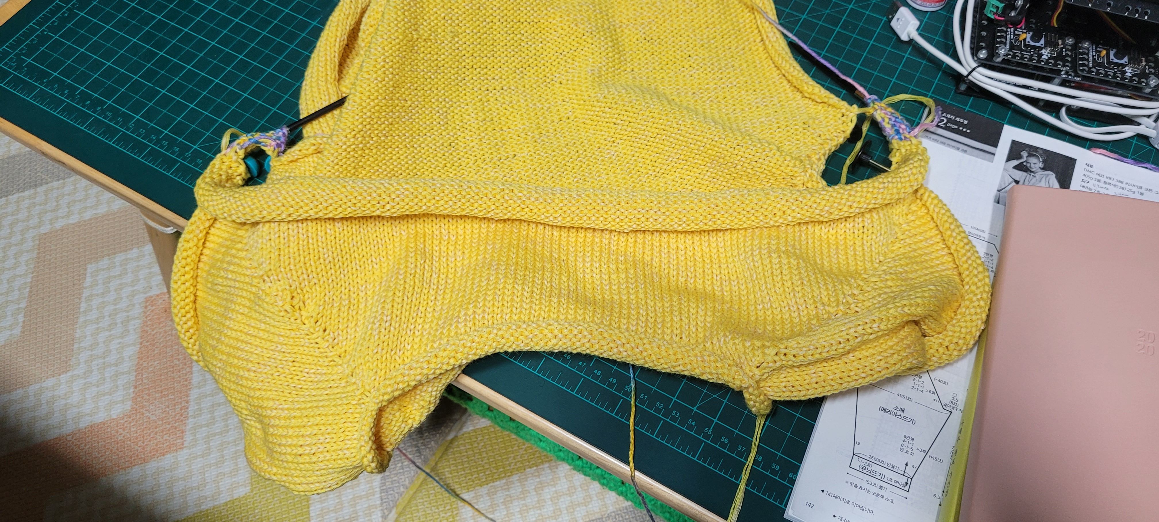 소매분리하고 옆구리 8코씩의 배색 때문에 앞뒤를 나눠 뜨기로 결정