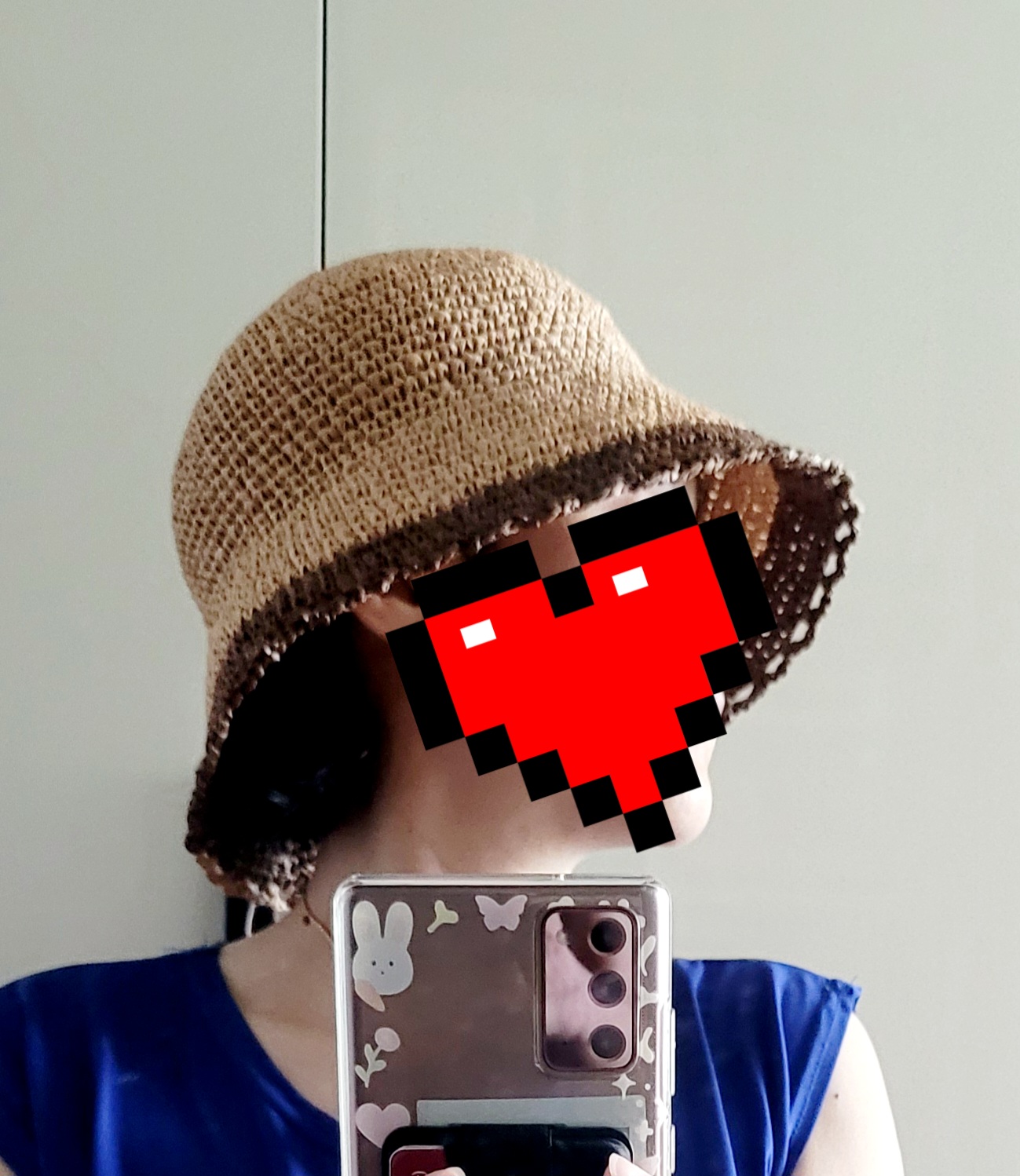 앞서 이야기했듯이 실이 혈기왕성하고 굵어서 원작보다 코바늘 호수를 하나 늘려야할 정도였다. 그래서 내 머리에 맞게 덜 늘리고 귀 즈음해서 세코 줄이고 마지막에 실 부족으로 사슬뜨기로 마무리라는 요소가 추가되어 다른 게 나왔다.