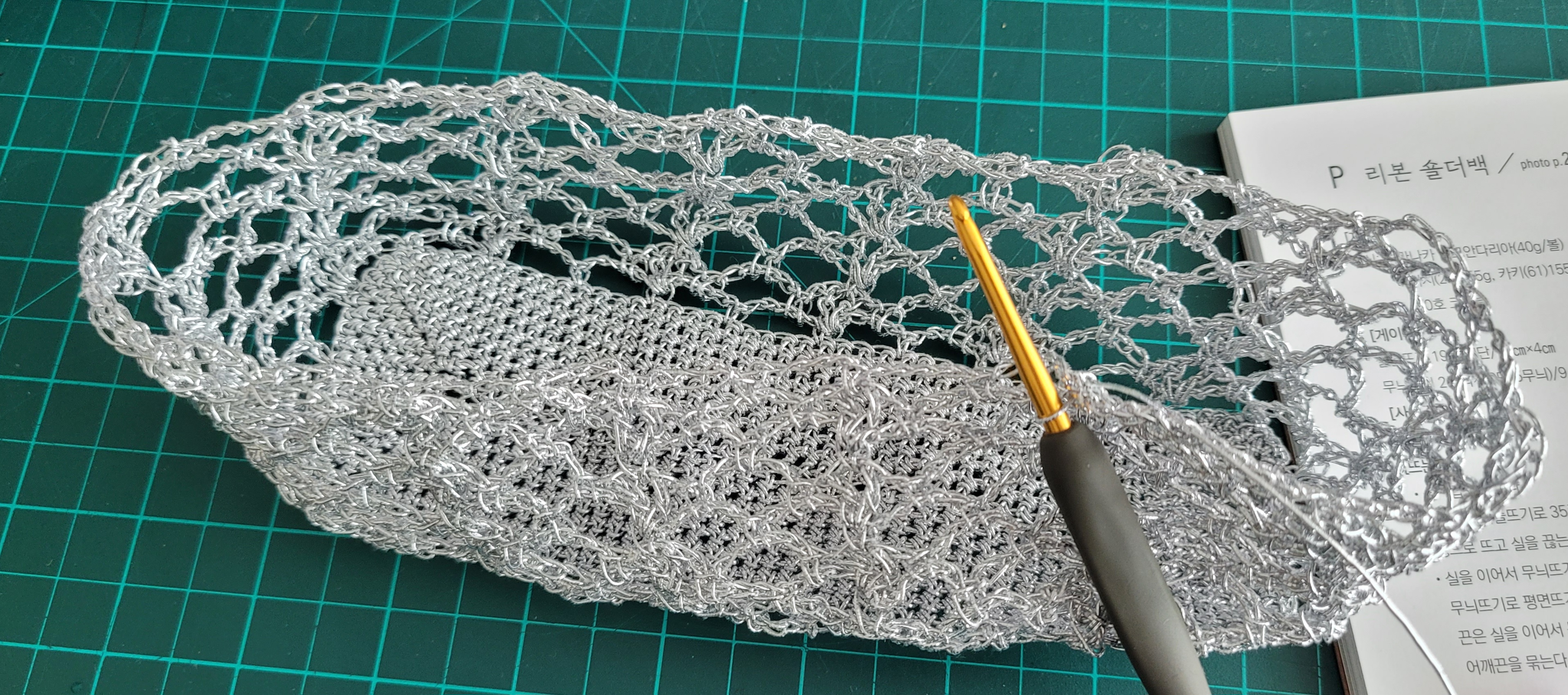 #어른스러운손뜨개가방과모자 에 실려있는 #리본숄더백 을 떴는데 가방바닥이 10센티 가량 작게 떠졌다. 메탈사 두겹으로 했어야 했을까?