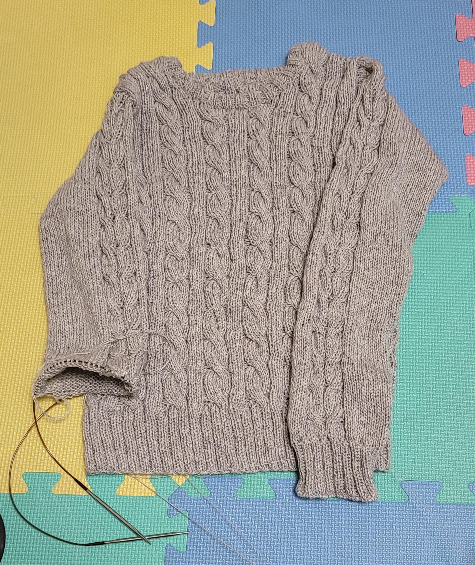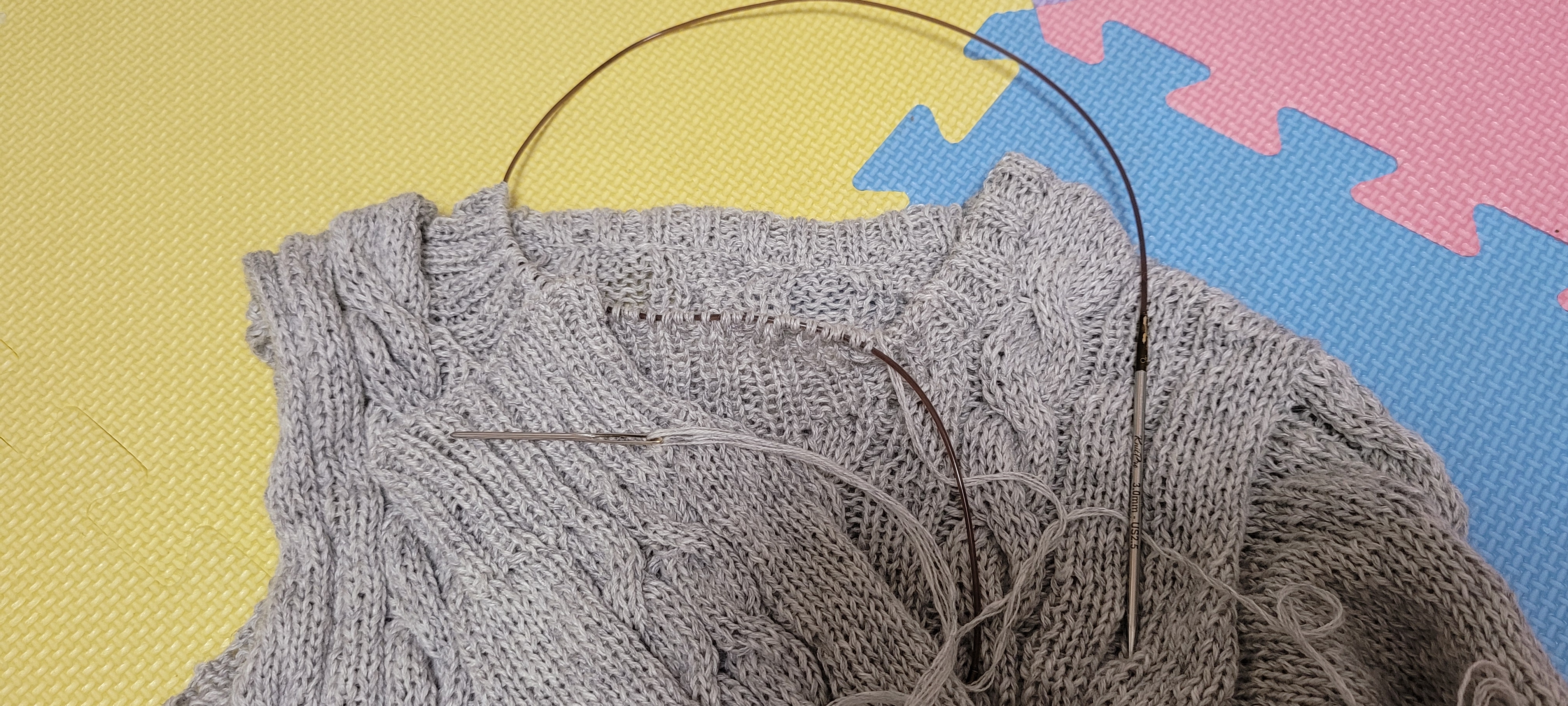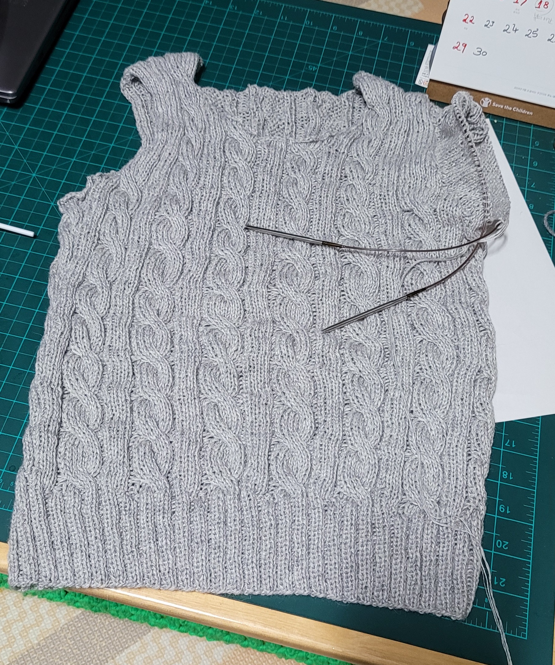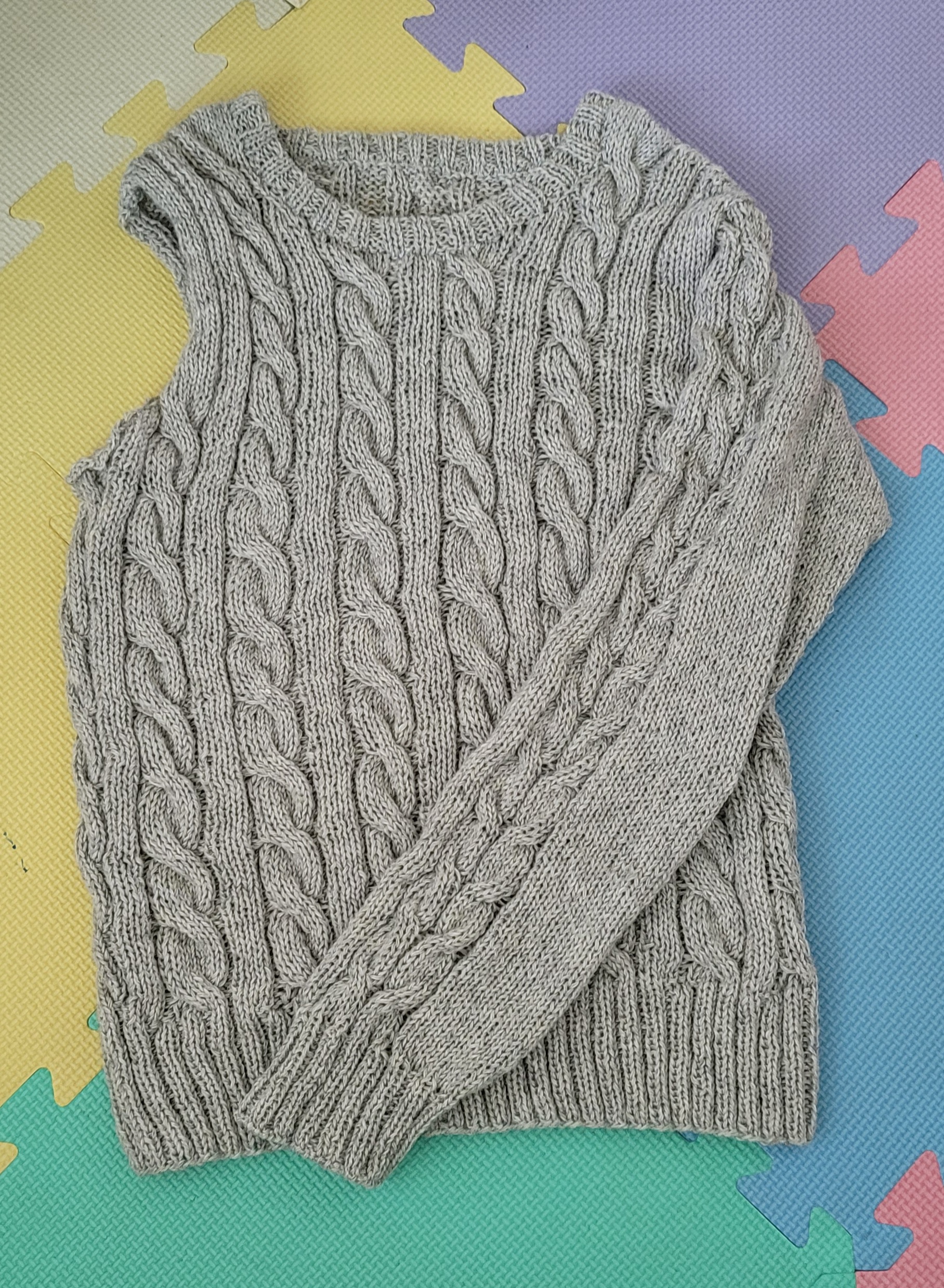 우측 팔 줄임 3코를 제대로 못해서 손목 고무단 들어가면서 급 줄였다.쩝