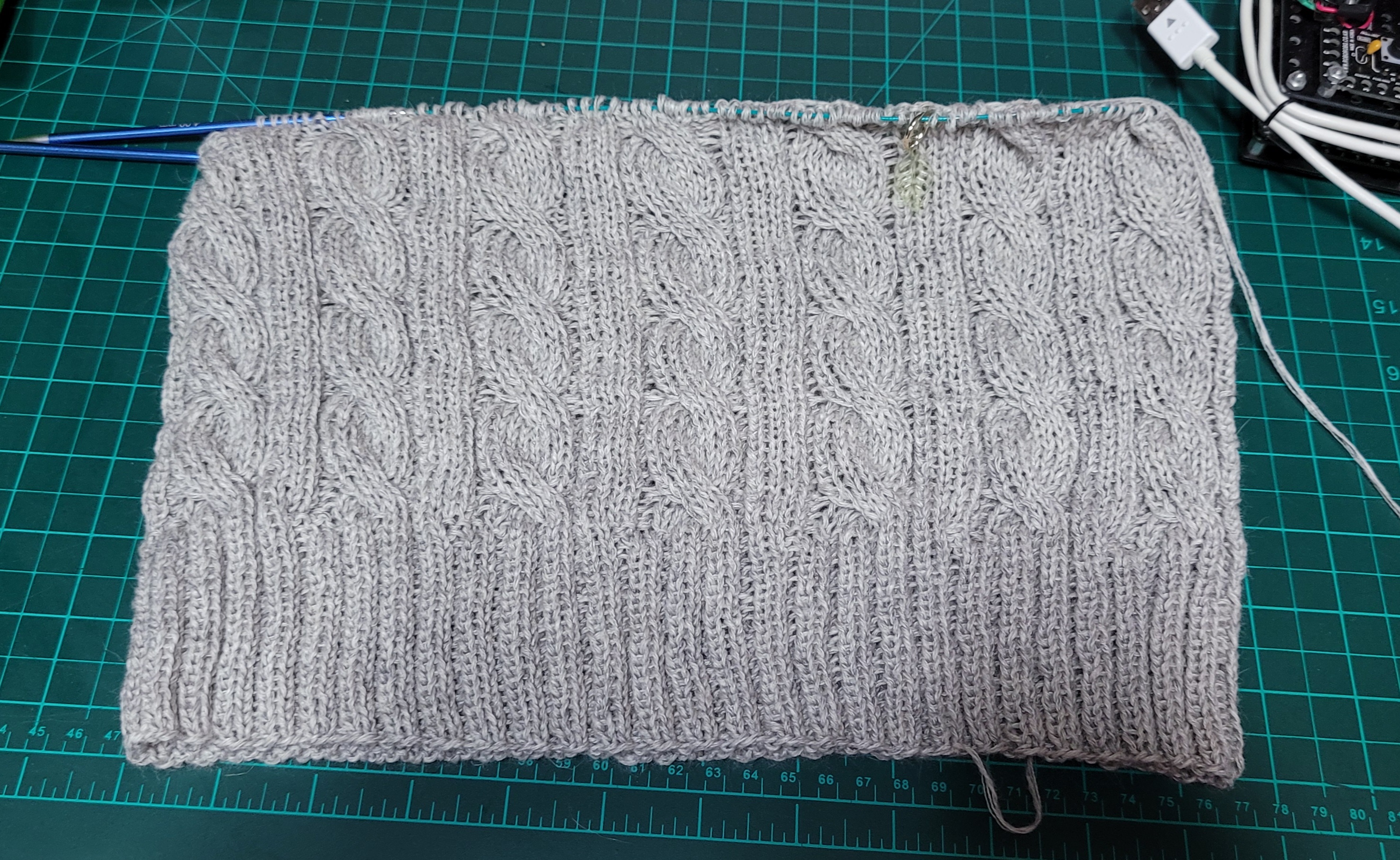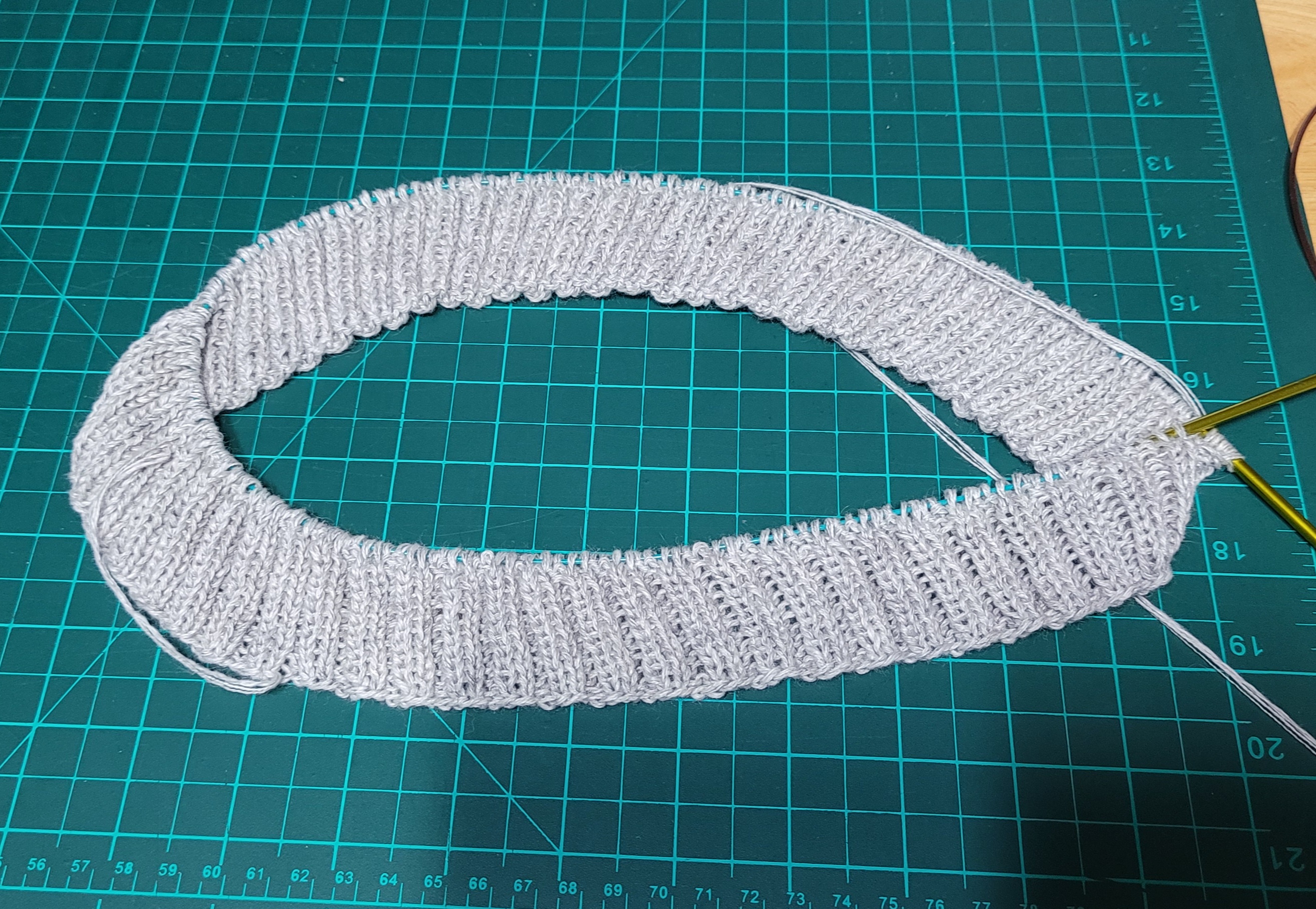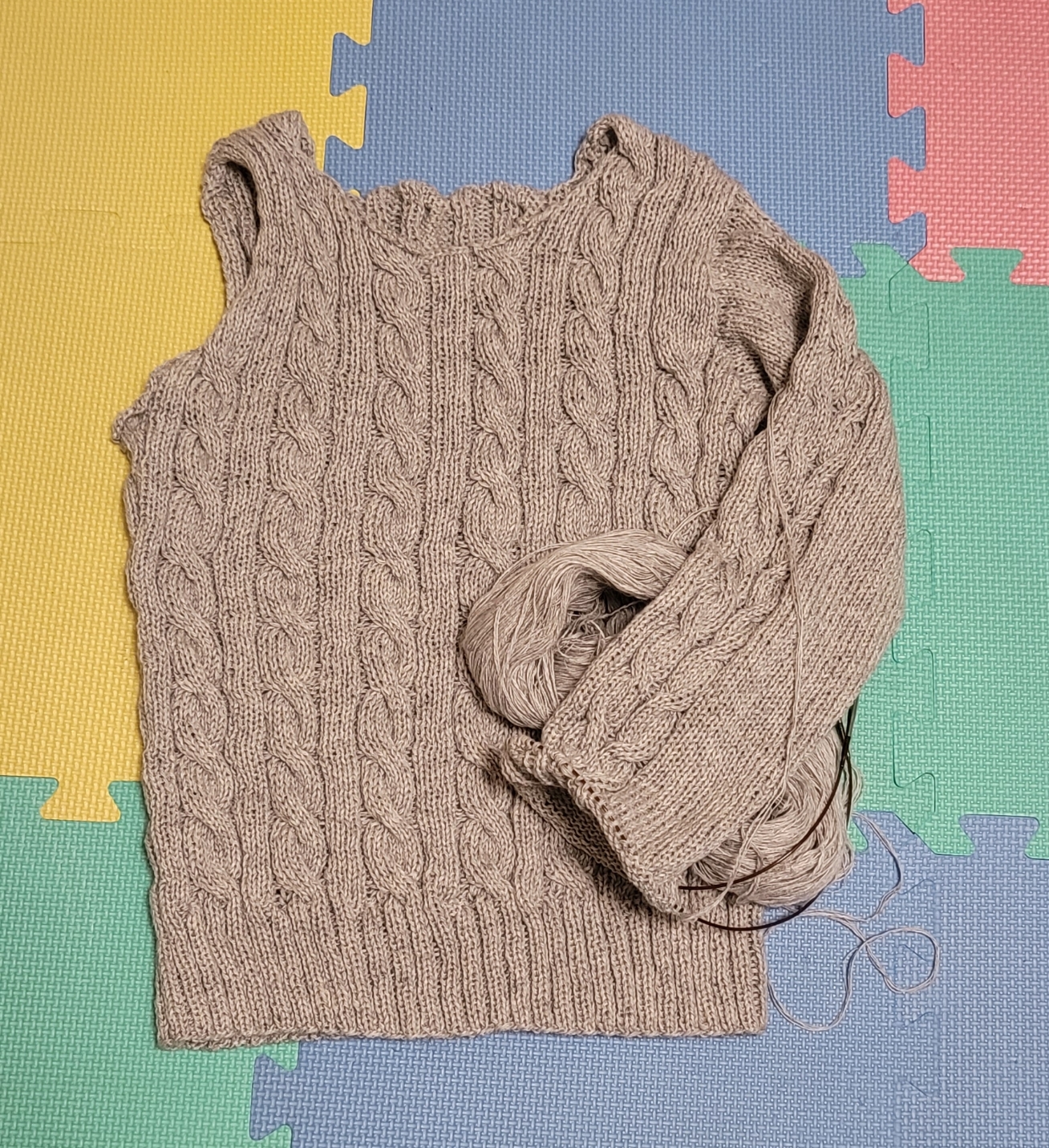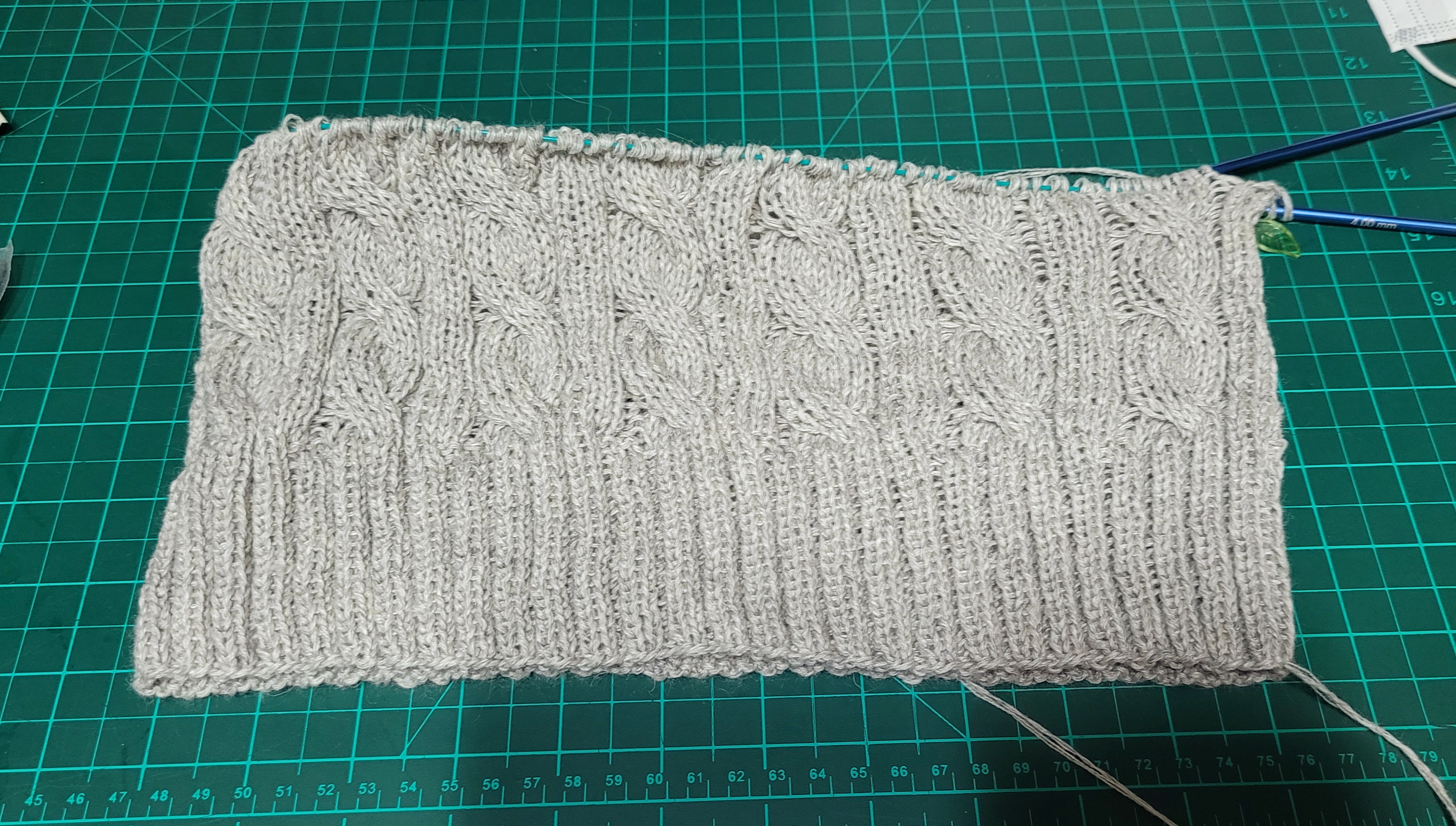 우측 팔 줄임 3코를 제대로 못해서 손목 고무단 들어가면서 급 줄였다.쩝