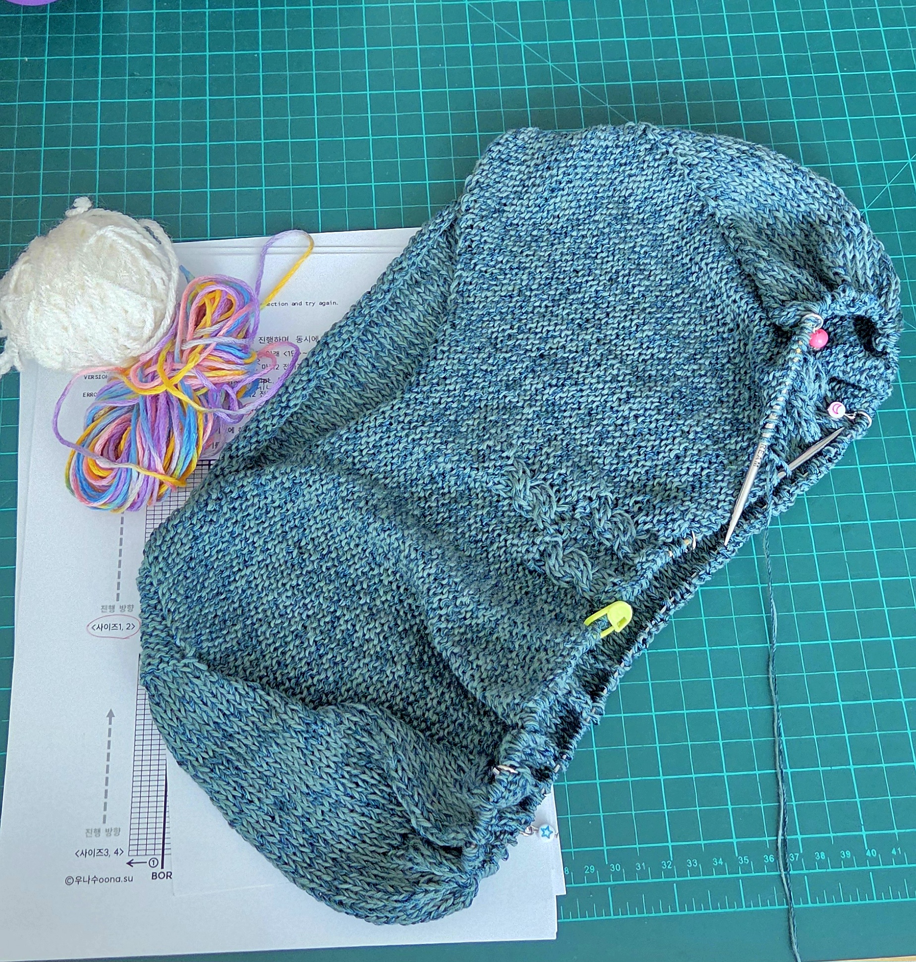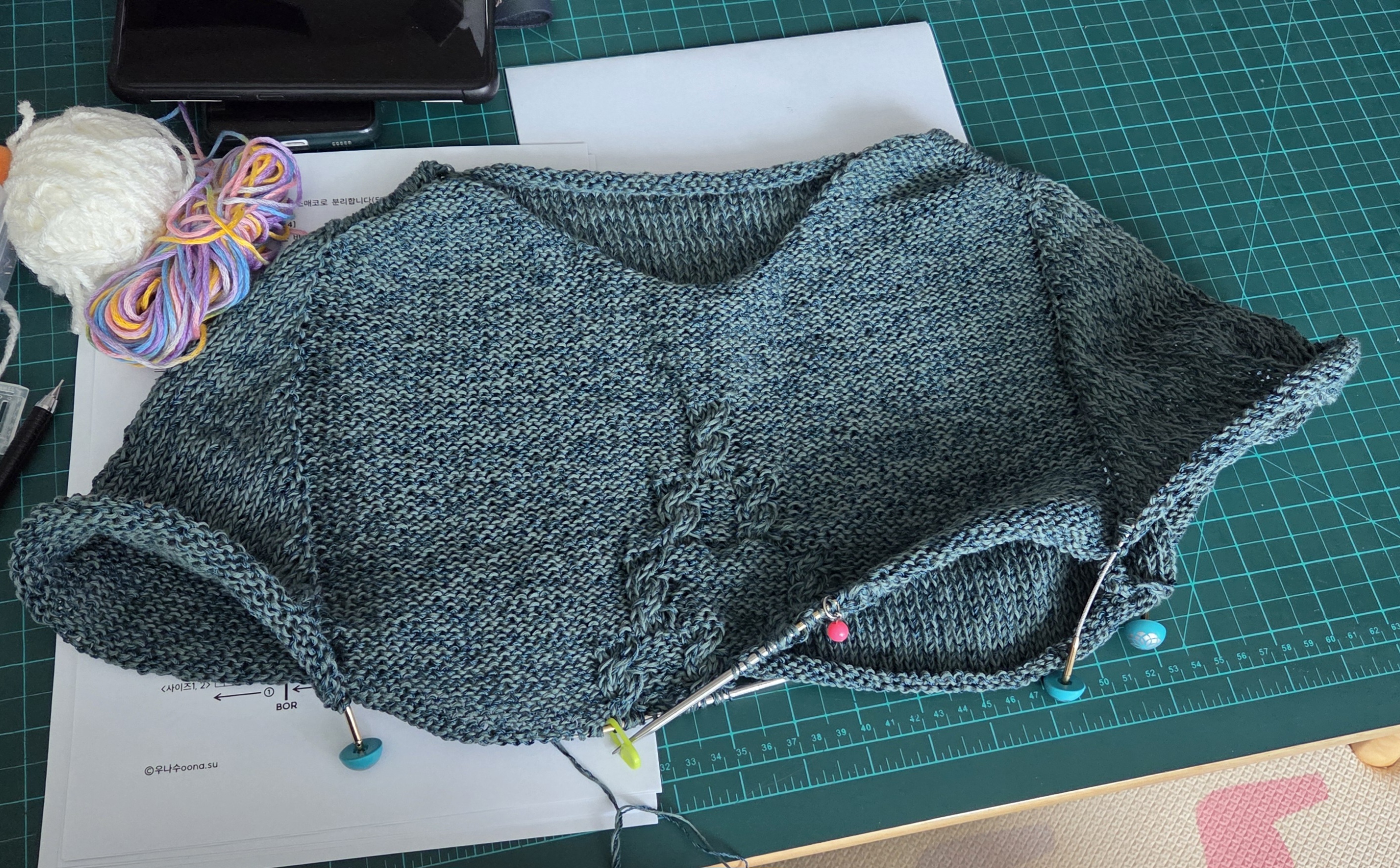 어깨라인이 여리해보이는것에 꽂혀서 테스터를 지원했는데 운이 좋게 뽑아주셨어요. 청송뜨개에서 제공받은 실이랑 니컨에서 구입한 실이랑 합사하니 색감도 괜찮고 스와치 게이지가 딱 맞게 나와서 다른 거 보지도 않고 코를 잡았습니다. 그러나..