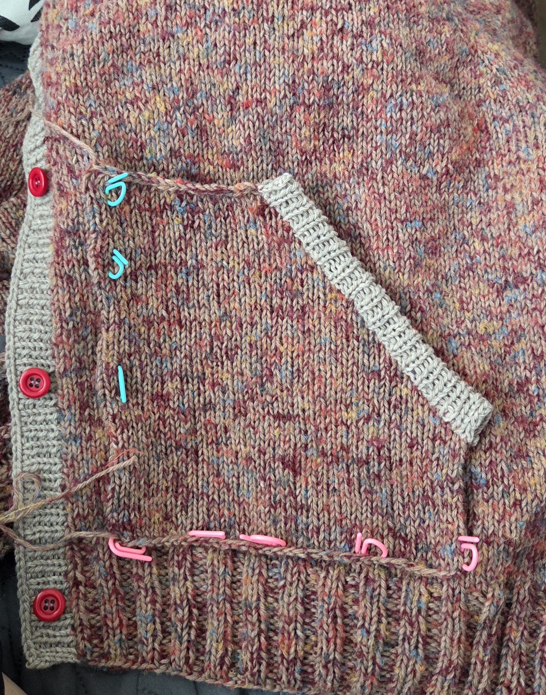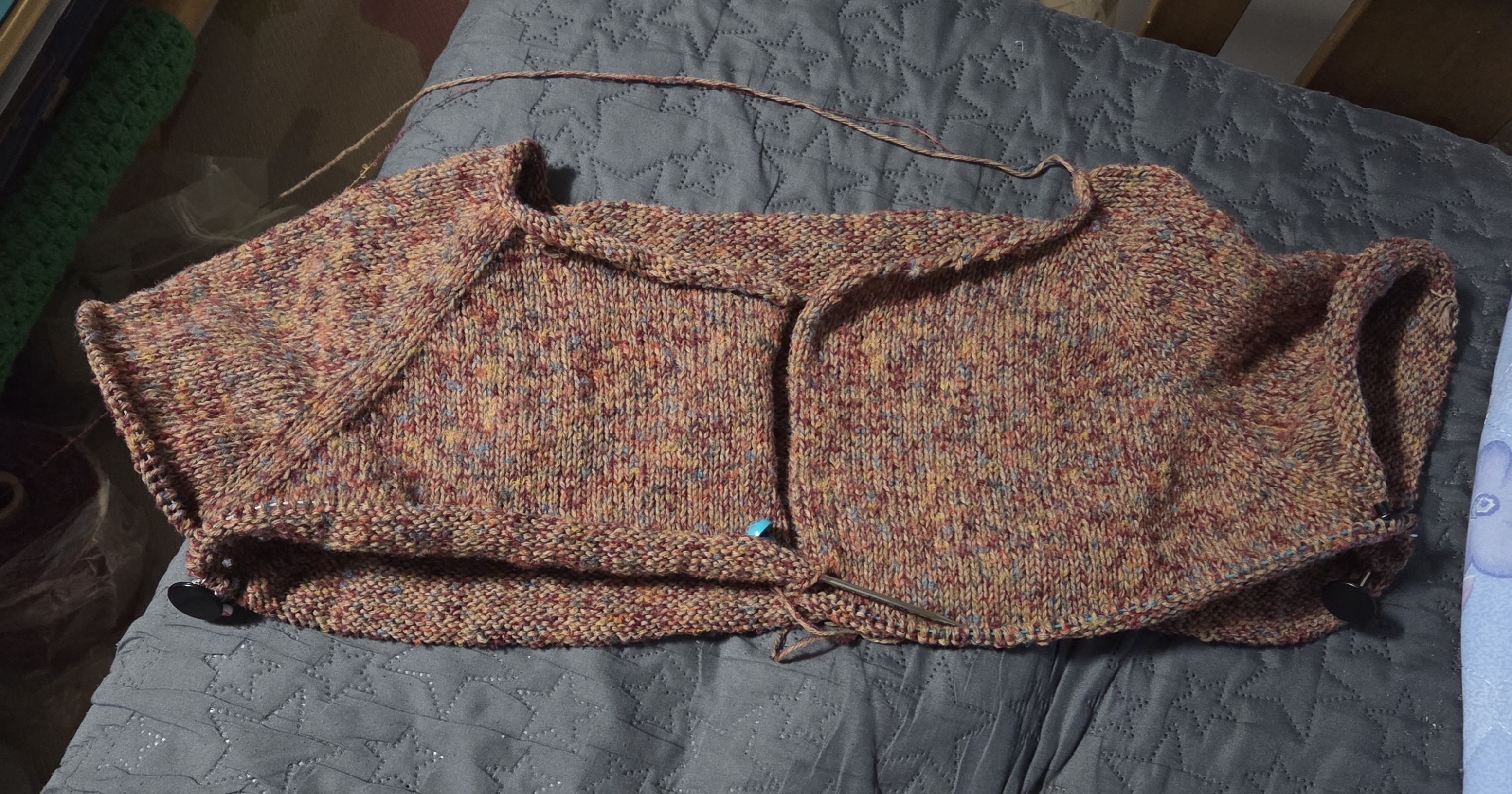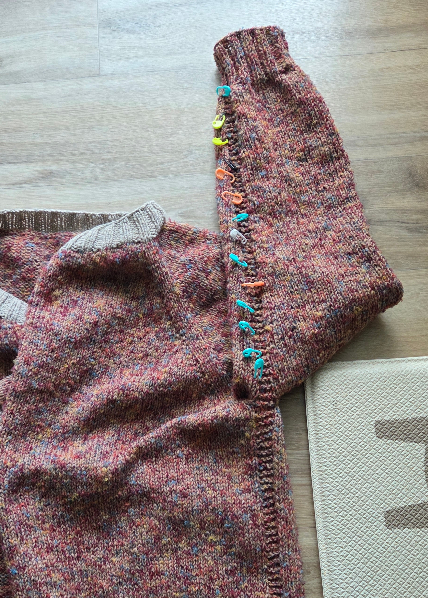기본 래글런으로 주욱 뜨다가 소매 분리를 했는데 그냥 메리야스로 뜨기엔 심심하더라. 그래서 옆구리에 가터뜨기를 넣었다. 평면뜨기에서의 가터는 참 좋은 방식이지만 원형뜨기에선 ㅠㅠ