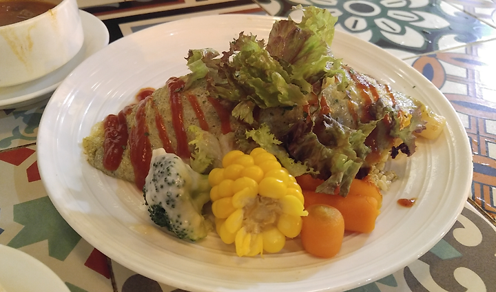 밥, 돼지고기인지 닭고기인지 알수 없는 것, 양배추찜, 찐생선(간장베이스에 가오리같이 부드러운 식감), 오리(이것도 간장베이스),계란익힌거, 계란토마토수프 등을 먹었다.