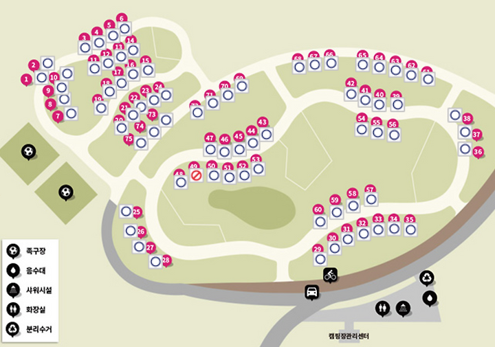 주차구역이 표시되어 있어서 그곳에 주차하고 나머지 구역 중 아무데나 텐트를 치면 된다.