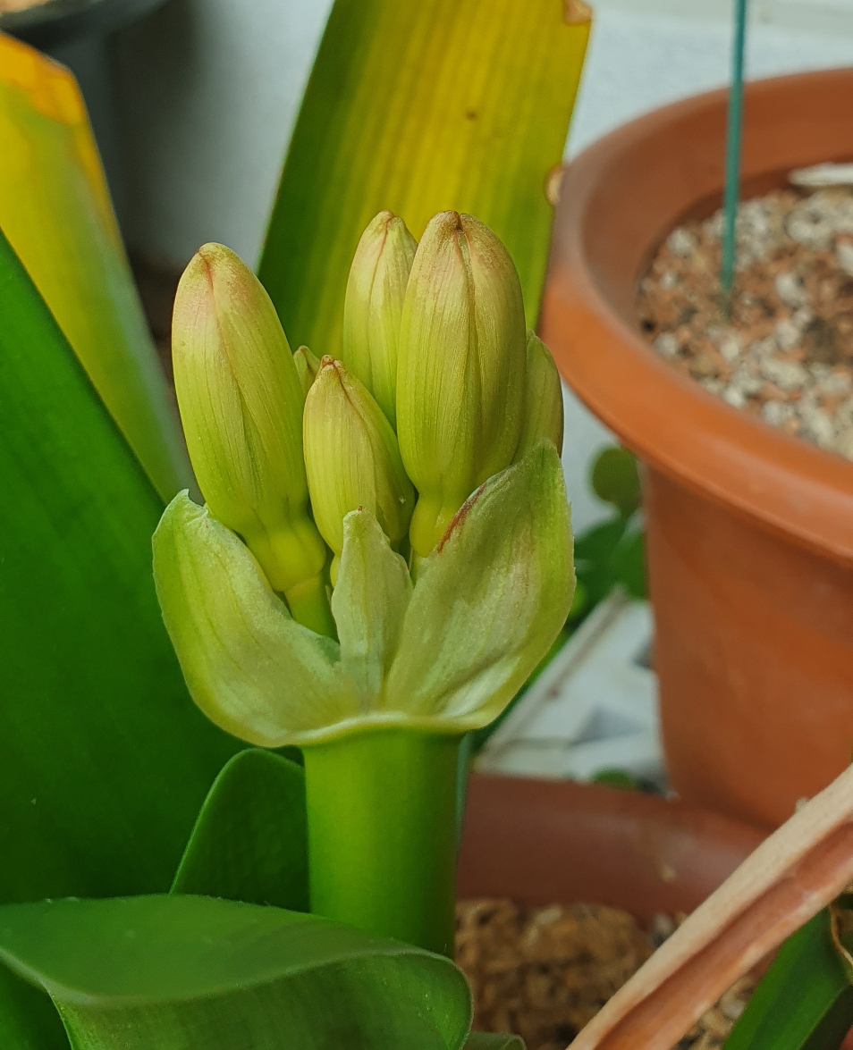 군자란 하나는 뿌리가 바깥으로 튀어나오고 잎사귀는 누렇게 말라가는데 꽃대가 올라온다.