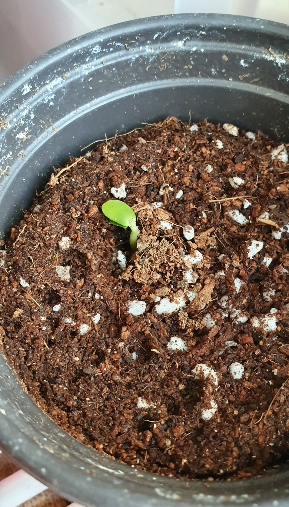 옮기고 나서 2일 후, 포트 세개 중 하나에서 빼꼼 고개를 내민 사과싹.