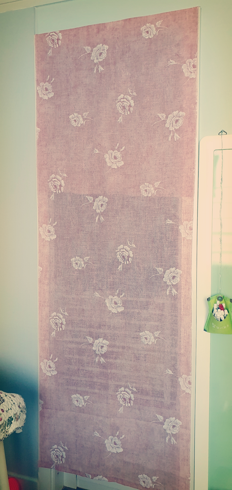 환기는 여전히 필요하고 그래서 갖고 있던 원단 중, 숭숭한 걸로, 아랫단만 처리해서 압정으로 박았다.