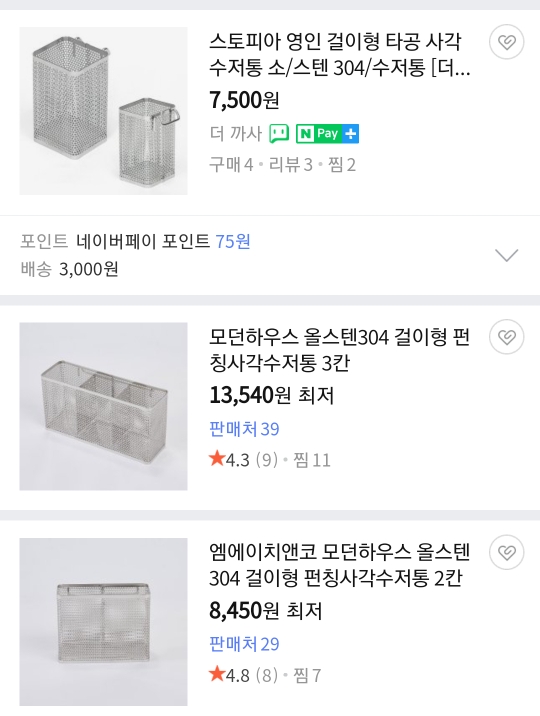 1차시도는 기존 수저통을 대신할 만한 스테인레스304 수저통을 검색해봤다. 세로형 꽂이만 검색된다. 사실 수저통 검색해보면 세로형이 주를 이룬다.