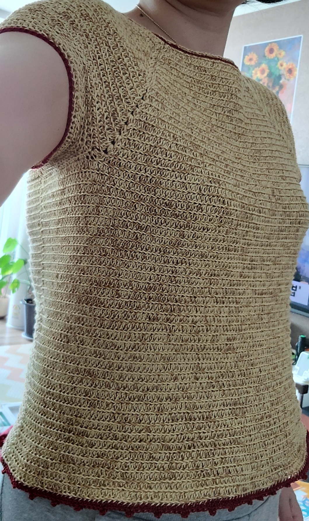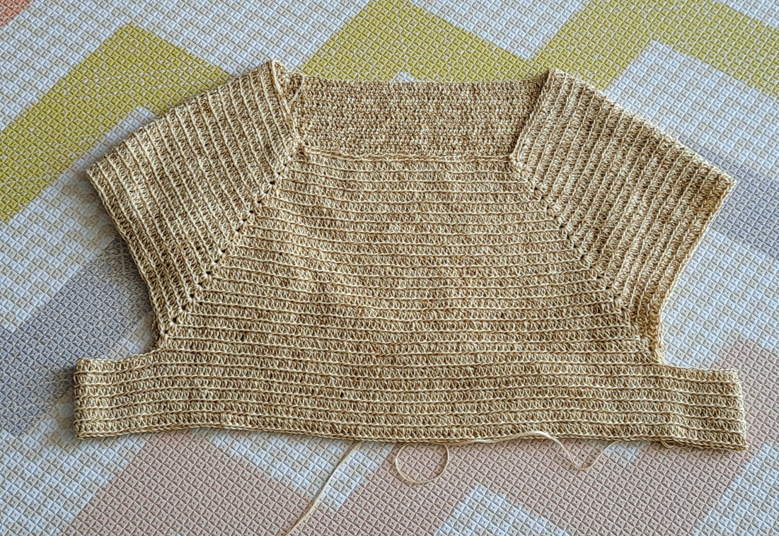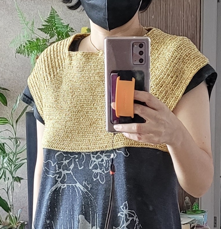 이거 바로 전에 겨드랑이까지 떴다가 엄마가 이상하니 다시 풀고 뜨라해서 .. 풀고 나눔받은 콘사실 합사해서 다시 떴다.