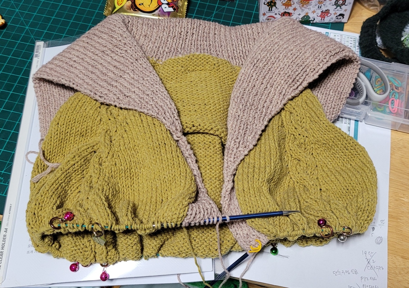 옆구리 꽈배기가 5단 단위로 떠진 것과 단추구멍을 잘못 낸 실수가 있지만 그나마 티나지 않아서 다행이다.