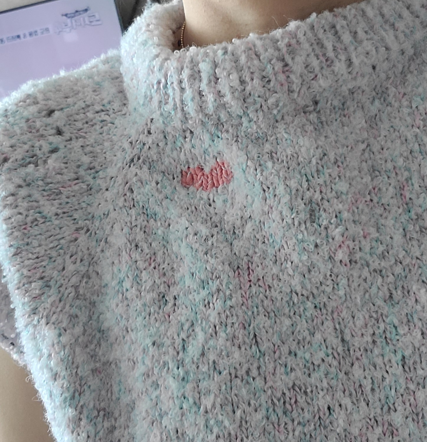 실은 굿실 부클에 집에 있는 띠지없는 분홍면사와 하늘색 면사?를 합사해서 떴어요. 하트가 주된 특징이라 몽글몽글하고 솜사탕 느낌이면 좋겠다 생각했거든요.