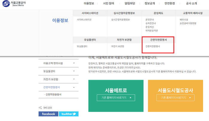 서울매트로 메인화면에서 이용정보 > 간편지연증명서를 누르면 된다.