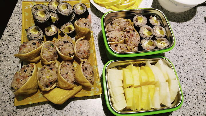 초밥,김밥,사과,바나나,배 다 싸줬으니