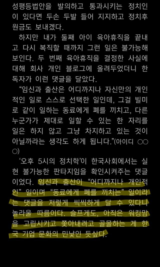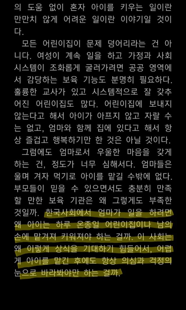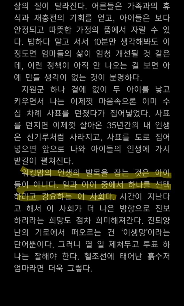 사회 전반이 바뀌어야 맘충으로까지 불릴 정도의 여성의 삶이, 그리고 남자의 삶이 바뀌겠지.