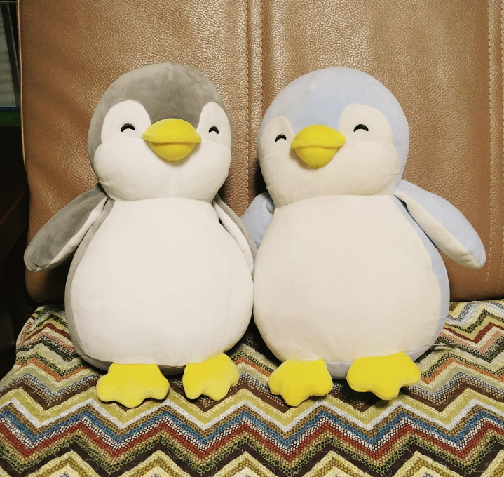 기분이 좋아지는 표정의 매우 푹신하고 보들보들한 펭귄인형 두마리.