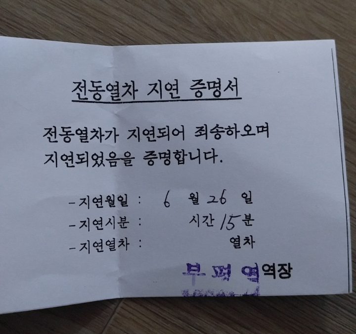 결국 부평역에서 자초지종을 설명하고 지연증명서를 받았다.