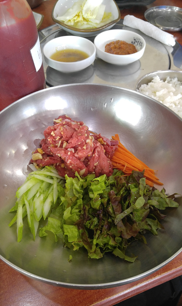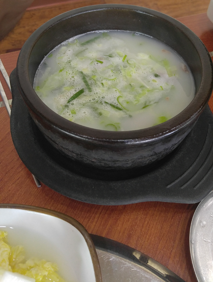 큰넘은 선지국에, 작은넘은 허연국물에 밥 말아먹이고 난 육회비빔밥, 아빠는 선지와 국물에 밥말아 먹음.