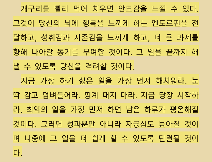 개구리는 현재 펼쳐진 일 중 가장 어려운 일을 뜻한다.