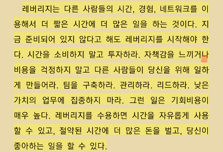 확실하게 돈 되는 일에 집중하고 그 외 소일거리 스러운 것은 다른 사람에게 위임하라는 것.